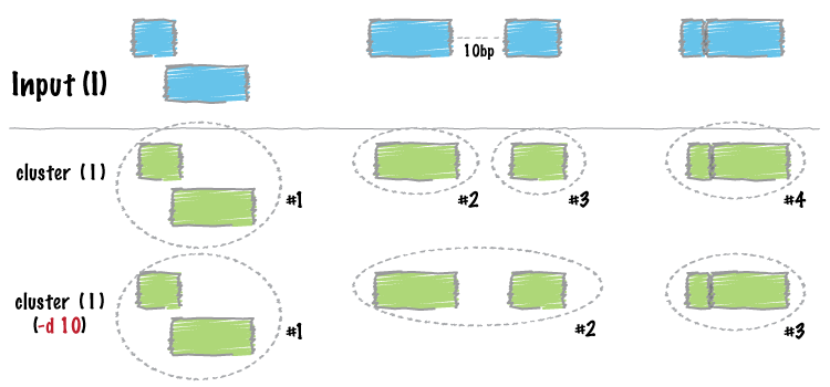 | cluster | Cluster (but don’t merge) overlapping/nearby intervals. |