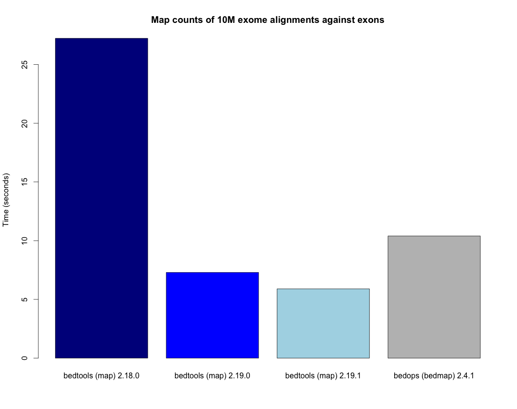 with sorted data as compared to the poor scaling for unsorted data. The current version of bedtools intersect is as fast as (or slightly faster) than the bedops package’s bedmap which uses a similar algorithm for sorted data. The plots below represent counting the number of intersecting alignments from exome capture BAM files against CCDS exons.