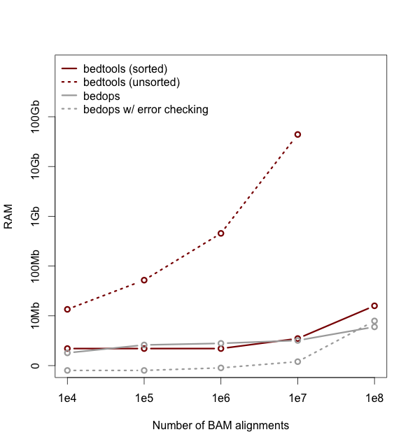 Note: bedtools could not complete when using 100 million alignments and the R-Tree algorithm used for unsorted data owing to a lack of memory.