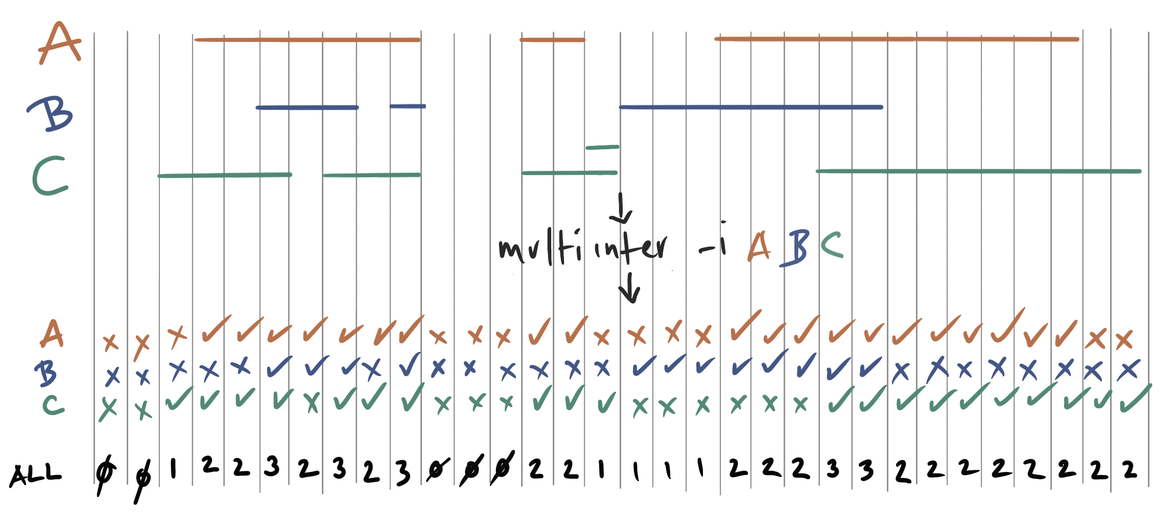 Two genome features (henceforth referred to as “features”) are said to overlap or intersect if they share at least one base in common. In the figure below, Feature A intersects/overlaps Feature B, but it does not intersect/overlap Feature C.